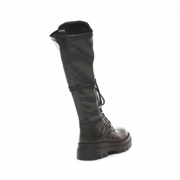 Modello stivale da donna anfibio in pelle con gambale in pelle stretch. Suola in gomma carro armato. Allacciato a 16 fori con laccio in tinta, logo aziendale sulla patta sotto laccio. Il fondo oversize , secondo gli ultimi trend della moda, definisce una nuova linea per un anfibio femminile, rendendolo perfetto non solo sotto pantaloni casual, ma anche sotto abiti romantici e gonnelloni, con un piacevole effetto a contrasto. Altezza tacco 50mm, platform 35mm con battuta 15mm. Altezza gambale 37cm