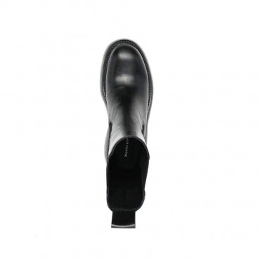 Modello stivaletto beatles Marlon black a 3/4 da donna in pelle ed elastico colore nero. Calzata facilitata dall'elastico ai lati e dal tirante all'apice posterior .. Altezza fusto 20 cm. Forma tonda e fondo roccia dal distintivo disegno in EVA: altezza tacco cm 6.5 plat anteriore cm 3.7.