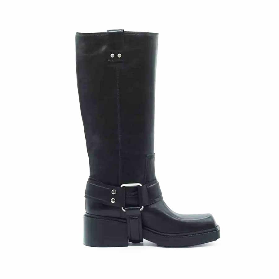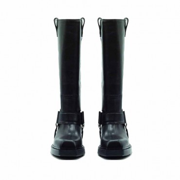 Modello stivale donna Fray Gaucho in pelle di vitello lucido. Con cinturone estraibile con anelli squadrati e logati con motivi bombè. Suola in gomma importante con battisdrada antiscivolo. MOrbido plantare ricoperto in pelle