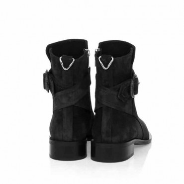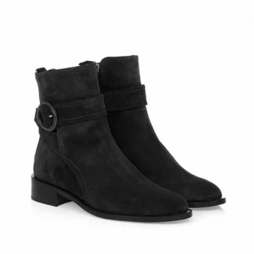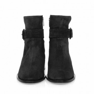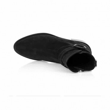 Modello tronchetto da donna camoscio colore nero. Cuciture a vista. Cinturino di abbellimento con fibbia rivestita in pelle. Chiusura con zip laterale. Interno e sottopiede, non estraibile, foderati in pelle. Suola in gomma.