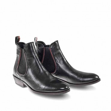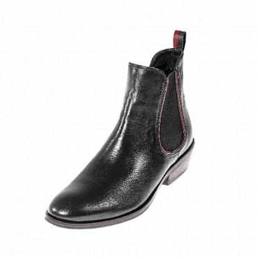 Modello stivaletto donna beatles in pelle colore nero. Con riporti multicolor nero bordeaux verde bosco lungo la molla tipica del modello e anello di pelle alla caviglia che non solo decora ma facilita la calzata. Fondo in gomma.Tacco 3 cm a contrasto marrone con sfumatura bordeaux