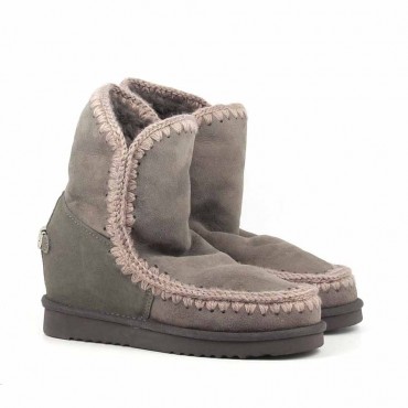Modello eskimo nella versione short che è la versione corta che si aggiunge alla iconica collezione eskimo con una zeppa interna. Modello realizzato a mano in montone double-face colore grigio carbone (charcoal cha) straordinariamente caldo con cuciture in lana lavorate all'uncinetto in tinta con leggero effetto a contrasto. Questo modello accattivante è dotato di tallone rinforzato, resistente suola in EVA e zeppa interna di 5 cm che regala una silhouette più snella e slancia la figura. Incredibilmente comodo da indossare. Altezza dello stivale 22 cm. Con conchiglia di sostegno, tallone rinforzato e resistente suola esterna in gomma ed EVA. Vestibilità regolare.