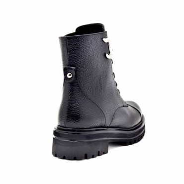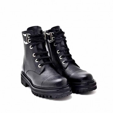 Modello tronchetto anfibio donna in pelle grana dollaro colore nero. Allacciato come il classico anfibio militare reso femminile dagli ultimi due agganci per lacci definiti da metalleria gioiello decorativa per un elegante contrasto. Sul lato interno dello stivale una zip permette una piu rapida e confortevole calzata. Tomaia cucita sul classico fondo in gomma con tassellatura a carro armato. In gomma extra light. Utilizzabile non solo con i classici pantaloni di taglio maschile ma anche con gonne e abiti per un effetto rock