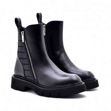 Modello tronchetto donna alla caviglia in pelle colore nero con mesh in tessuto trapuntato colore nero in tinta. Su fondo gomma carro armato ultra light. Calzata facilitata dal zip alla caviglia. Il tronchetto dalla linea sobria puo essere utilizzato nel quotidiano sotto pantaloni, ma anche sotto leggins o abito e pantacollant per un look informale e ricercato. Il fondo 5 cm cucito vulcanizzato e gambale 23 cm. Design esclusivo e produzione Made in Italy