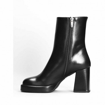 Modello tronchetto donna in pelle colore nero su tacco quadro con punta forma a mandorla e plateau fasciato in pelle in tinta. Calzata facilitata da zip laterale con tiralampo in metallo. Il tronchetto dalla linea sobria puo essere utilizzato nel quotidiano sotto pantaloni, ma anche sotto abiti per un look elegante e ricercato. Tacco 8.5 cm e gambale 23 cm da terra. Fondo in cuoio con puntalino in gomma antiscivolo per un confort maggiore.