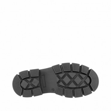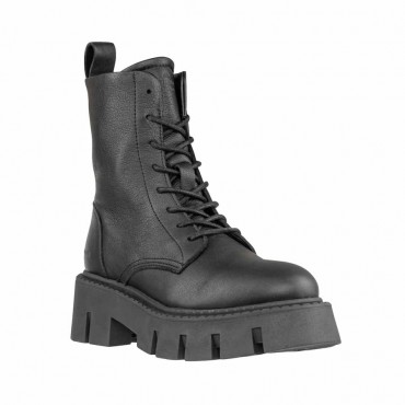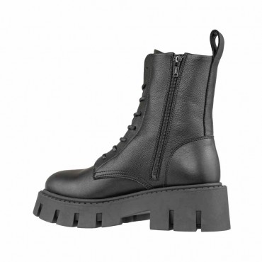 Modello Stivaletto alto fino alla caviglia di COPENHAGEN realizzato in morbida pelle di colore nero e caratterizzato da allacciatura sul davanti, logo esterno e la cerniera sul lato interno per facilitare la calzata. Internamente fodera in pelle. Soletta in pelle imbottita e rimovibile. Il fondo combat è in gomma nera e alza il tallone dal suolo di 6 cm e sulla pianta di 4 cm. Altezza gambale 15.5 cm.