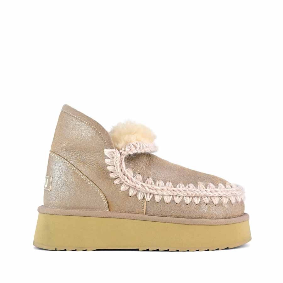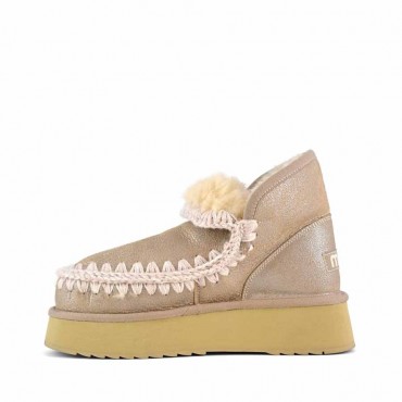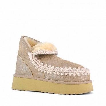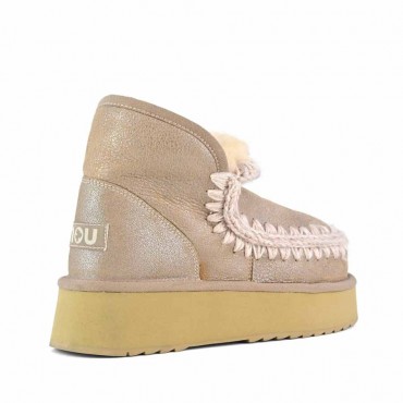 Modello tronchetto donna mini  eskimo è la Novità per l'autunno-inverno 2024: il mini eskimo platform boot è sapientemente realizzato a mano in lussuoso camoscio colore Stone Metallic (STME) e presenta le cuciture in lana all'uncinetto distintive di mou. Incredibilmente confortevole e resistente con suola in gomma EVA. Altezza 18 cm.