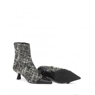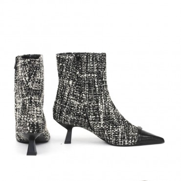 Tronchetto in tessuto ciniglia, colore bianco e nero - Con puntale in nappa nero - Zip laterale interna - Altezza tacco 60 - Fondo in gomma - Fodera in vitello - Made in Italy
