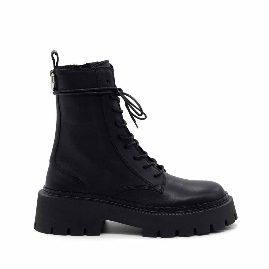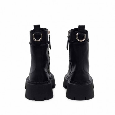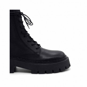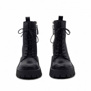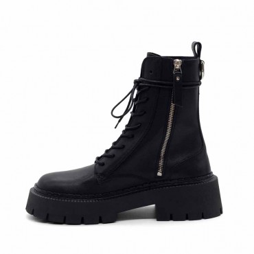 Modello Stivaletti donna H04 Bob-Anfibio nero in pelle di vitello semilucida, con zip interna e stringa cerata. Morsetto ad anello inserito come dettaglio nella cappiolina sul retro. Suola car in gomma con tacche dalla linea un po' scampanata, plantare ricoperto in morbida pelle di vitello. Made in Italy.