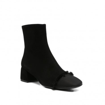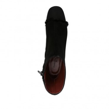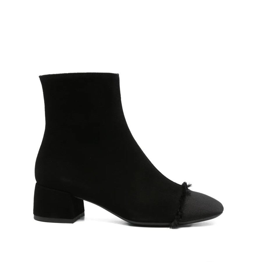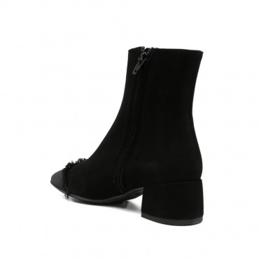 Stivaletto da donna su tacco da 4 cm, realizzato in pelle scamosciata nero con puntina in tessuto sfrangiato tono su tono e zip laterale per una calzata comoda.