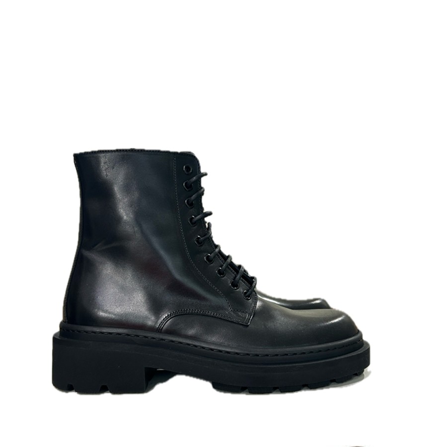 Stivaletto anfibio da donna in pelle delavè colore nero tamponato e cucito a mano con effetto vintage.