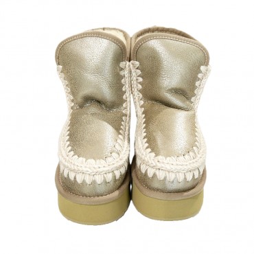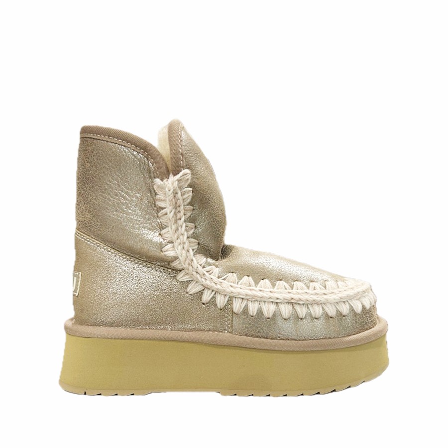 Modello Novità per l'autunno-inverno 2025: il platform boot di mou è sapientemente realizzato a mano in vero montone double-face colore beige stone metallic effetto metallizzato (STME) e arricchito dagli inconfondibili dettagli in lana all'uncinetto firmati mou. Incredibilmente confortevole e resistente con suola in gomma EVA. Altezza: 5cm.