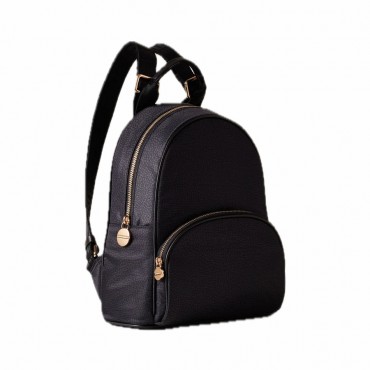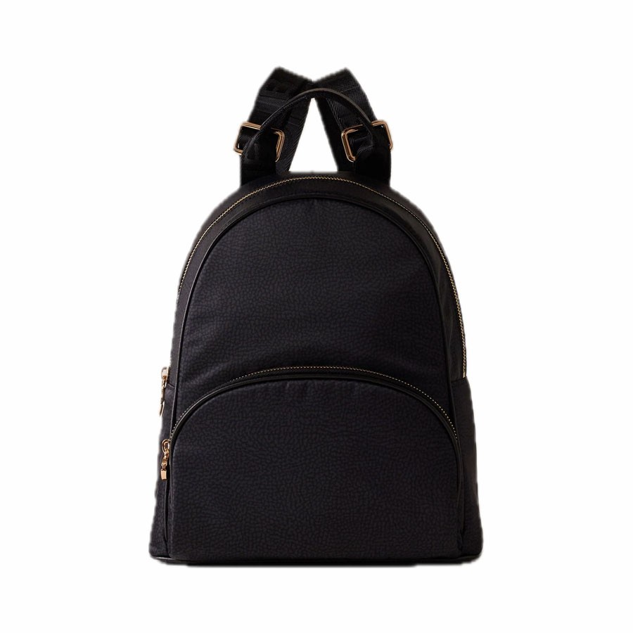Modello zaino donna in tessuto stampa op dark black . Lo zaino Medium di nylon riciclato OP è impreziosito da piping di pelle. Gli spallacci regolabili sono realizzati con nastro di nylon logato a jacquard. La chiusura è con zip, come la tasca esterna. Interno foderato. Le metallerie sono in galvanica oro chiaro