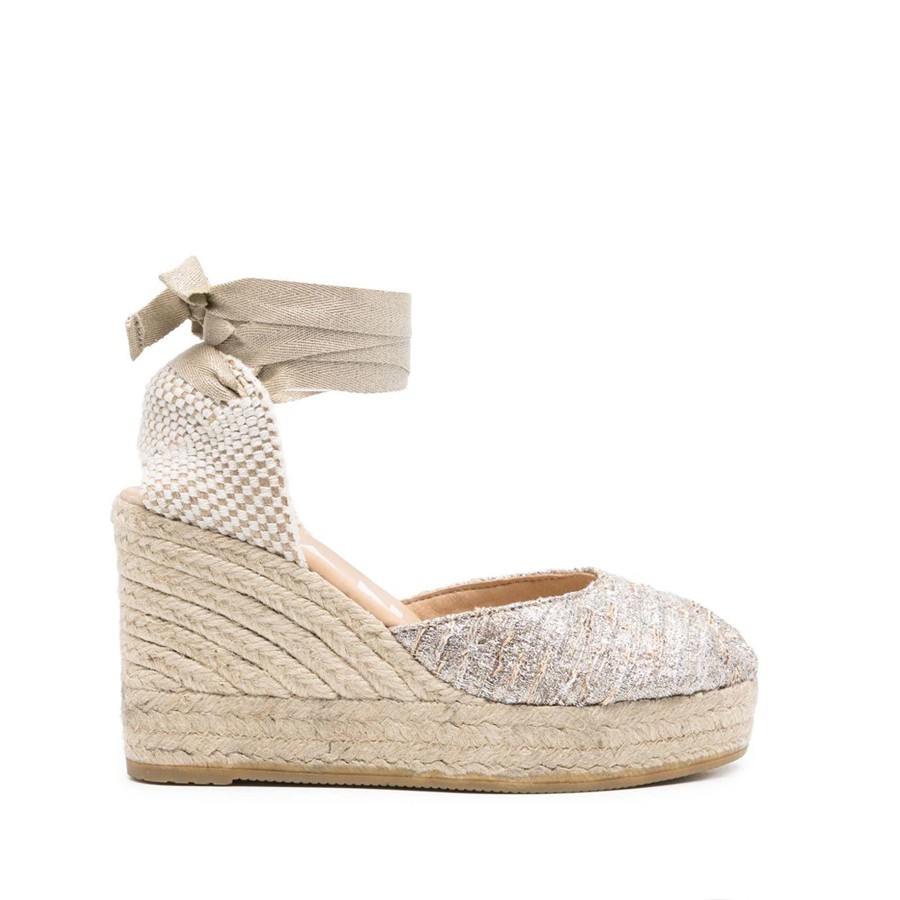 Le espadrillas di Manebi si presentano con un design dal finish brillante in lurex. Modello con punta tonda, lacci con glitter alla caviglia, zeppa in rafia e suola in gomma.